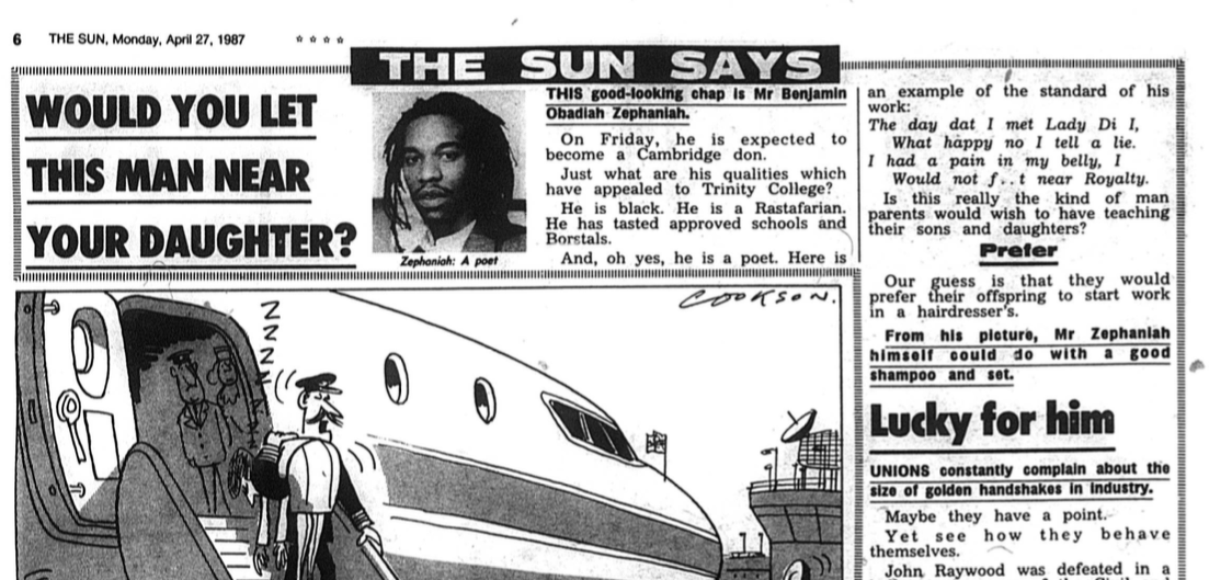 The Sun, for example, published a hit piece on him with the headline: “Would you let this man near your daughter?” With his dreadlocks on display, they ran the caption: “From his picture, Mr Zephaniah himself could do with a good shampoo and set.”
