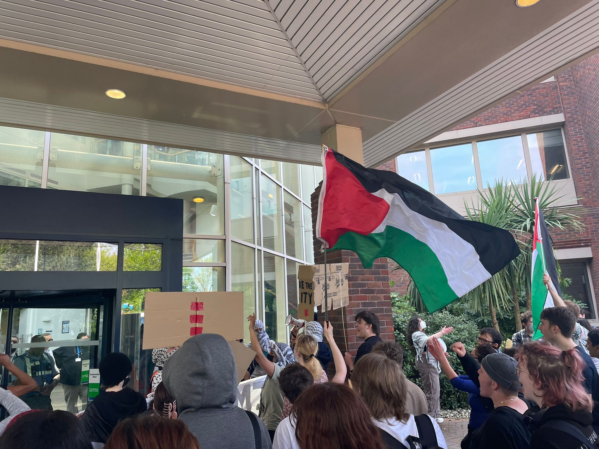 This caused security to amass in response, but this did not deter anyone in attendance. We saw people banging the windows in unison with chants declaring the university as complicit, as well as chants calling to “divest and disclose”.