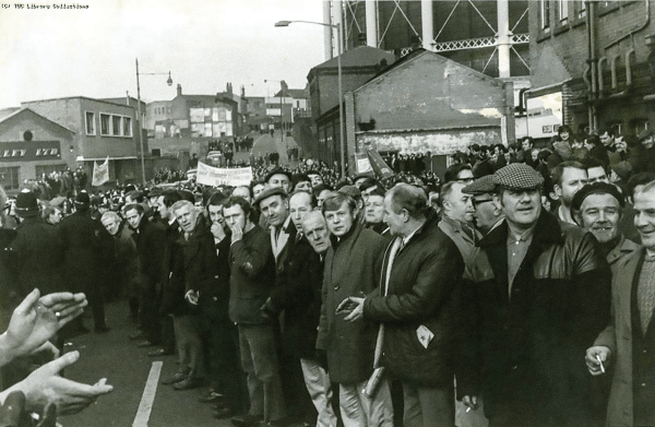 “Some of the lads…were a bit dispirited…And then over the hill came a banner and I’ve never seen in my life as many people following a banner. As far as the eye could see it was just a mass of people marching towards Saltley…Our lads were jumping in the air with emotion – fantastic situation…I started to chant…‘Close the Gates! Close the Gates! And it was taken up, just like a football crowd.”